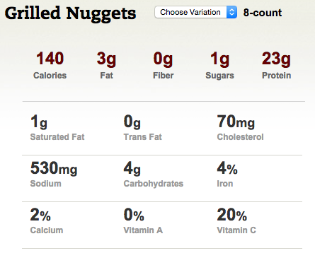 Chicken nuggets every three to four hours does sound terrifying, at first. But the chain is recommending its grilled chicken nuggets, essentially eight pieces of grilled chicken with 23 grams of protein and just 140 calories. With 530 milligrams of sodium, they’re well under the daily limit of 2,300 grams recommended in U.S. dietary guidelines. And they have less than one third of the daily cholesterol limit for healthy people.